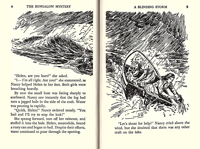 The Bungalow Mystery starts off with Nancy and her friend Helen enjoying a motorboat ride on a small lake when a huge storm blows up suddenly.